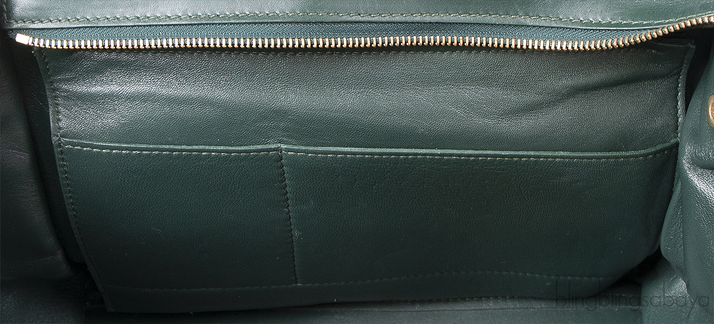 The bag also features one zippered pocket on the back side and the top zip opening reveals a very roomy interior lined with leather featuring two open interior compartments.