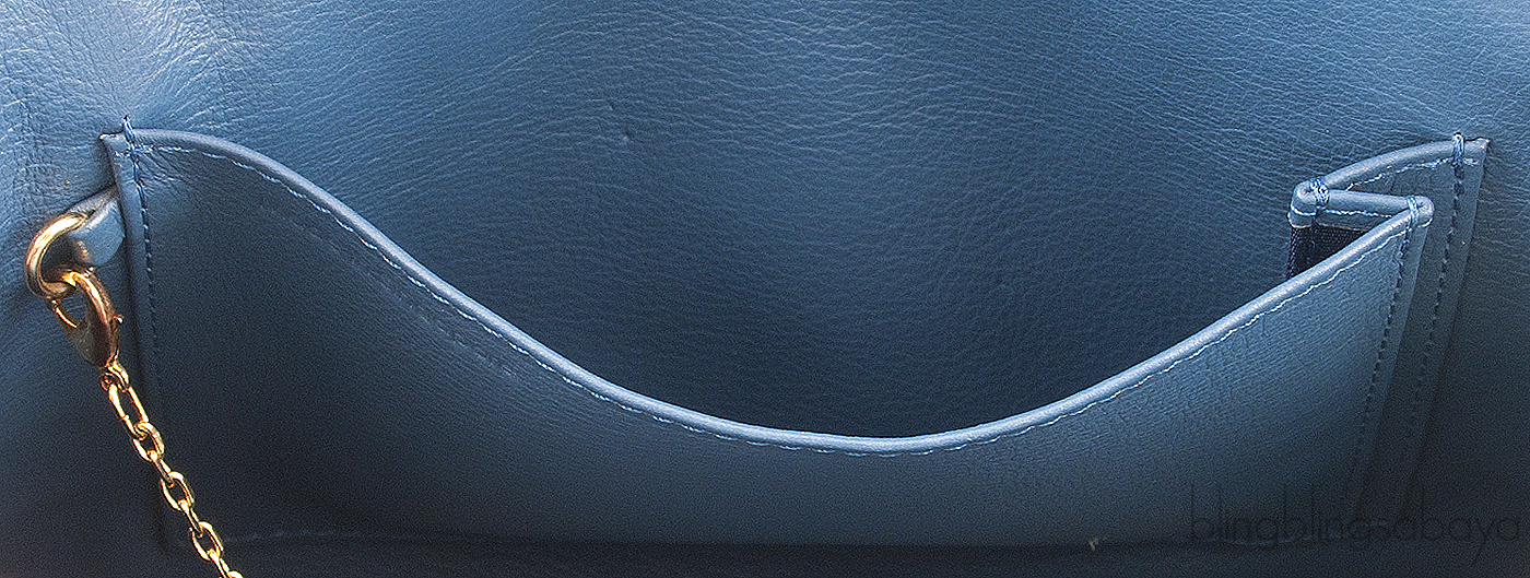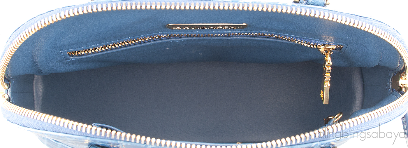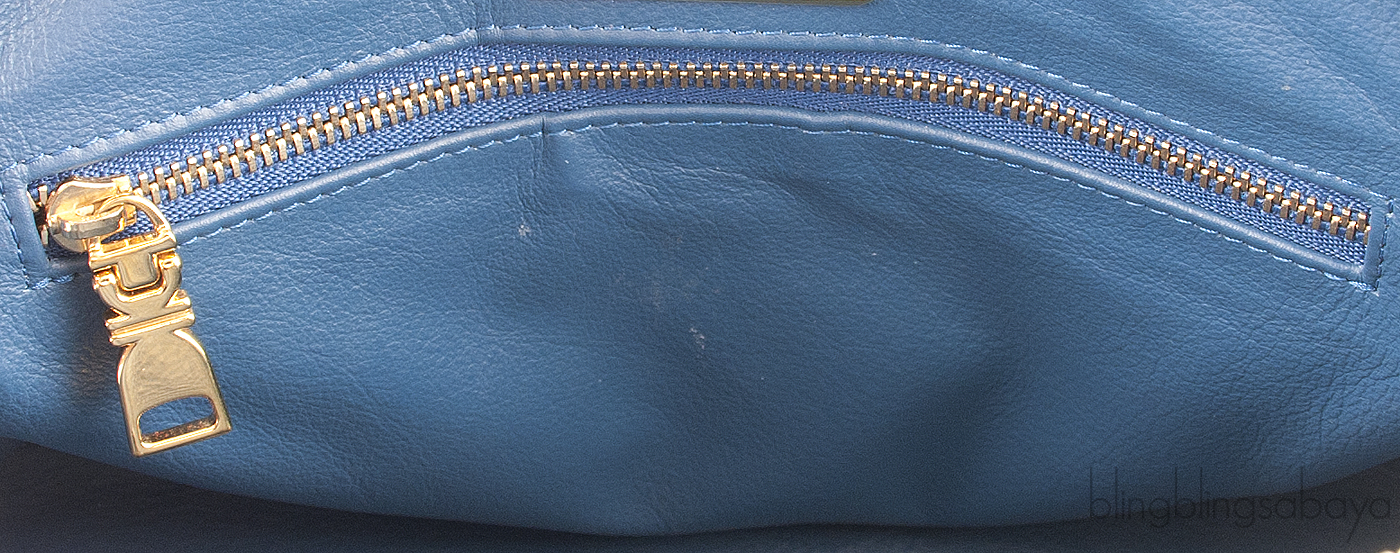 It has the zip top closure with leather zipper pulls that opens to gives access to an interior lined with coordinating with one zip pocket and patch pocket inside.