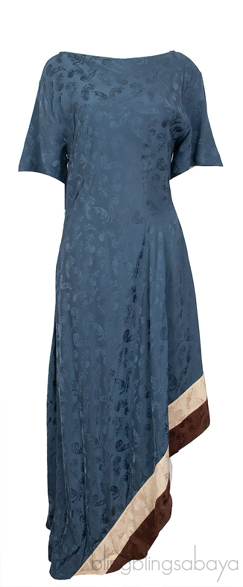 This Tri-color Printed Asymmetrical Hem Dress from Loewe is crafted in 100% Polyester fabric featuring printed fabric in blue grey with biege and brown contrasting trim at hemline, bateau neckline, short sleeves, asymmetric hem and zip fastening on the side.