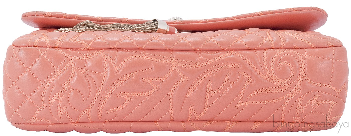 This Vanitas Medea Quilted Barocco Bag from Versace is crafted in orange quilted leather accented with the golden hardware. This so feminine shoulder bag features a baroque quilting motif with leather greco shoulder strap. It has gold and enamel medusa charm closes atop the snap fastener with chain tassel. Interior features a printed fabric lining with one open pocket and cellphone compartment with leather trimming.