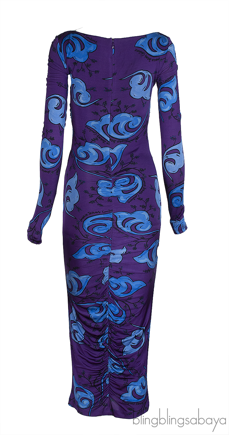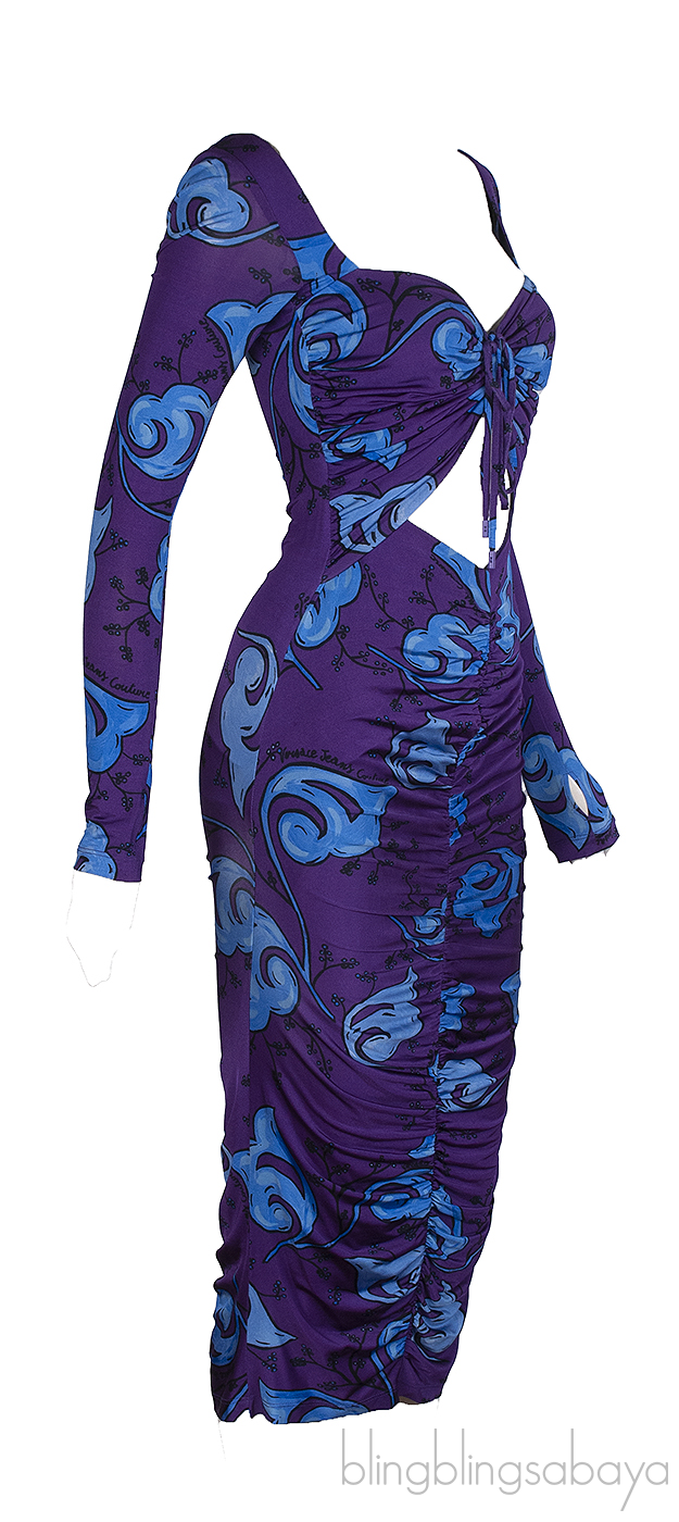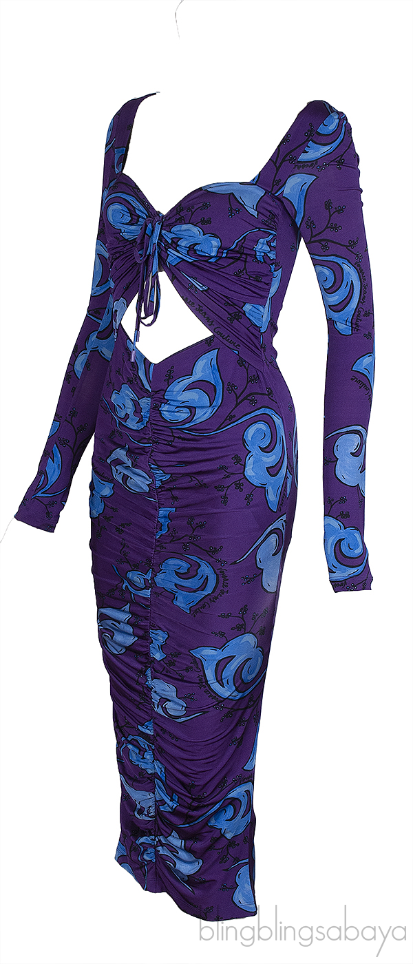 This Versace Jeans Couture Purple Print Cut-Out Dress is crafted from 96% Viscose and 4% Elastane in purple and blue hue. This dress features a sweetheart neckline with ties, cut-out at front, long sleeves, zip fastening at back, frilled effect and logo2 detail at back.