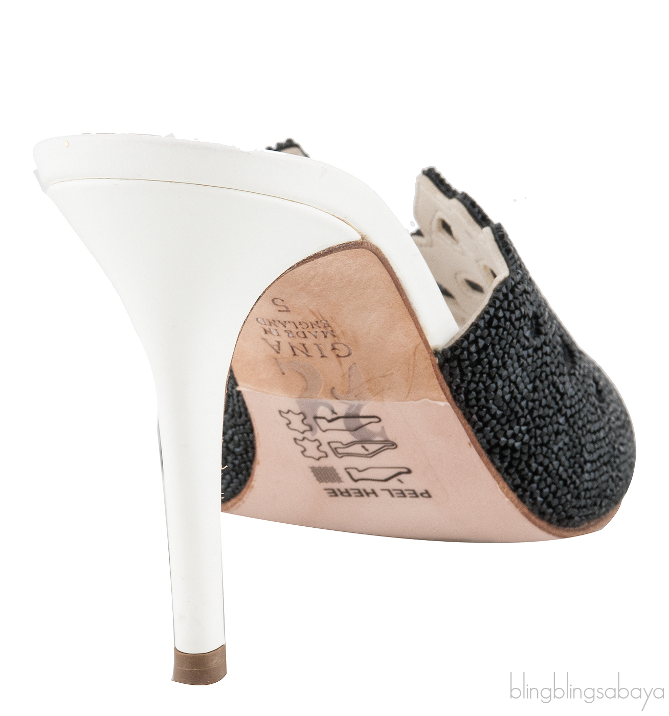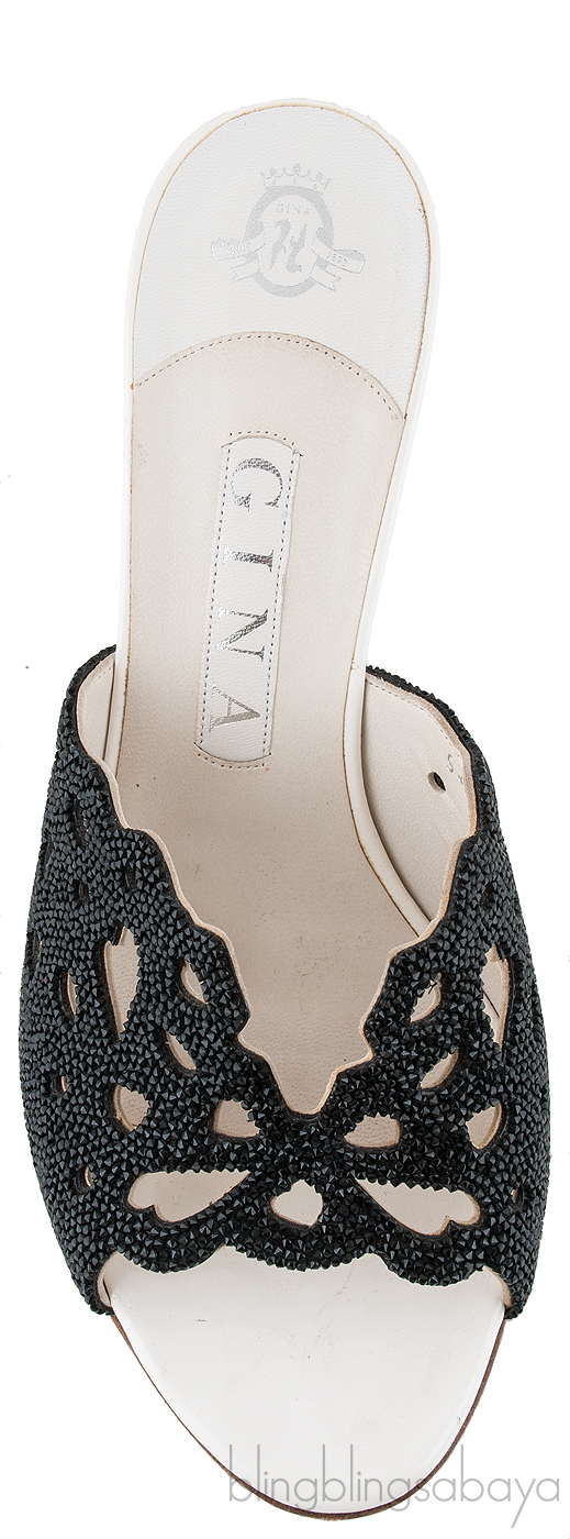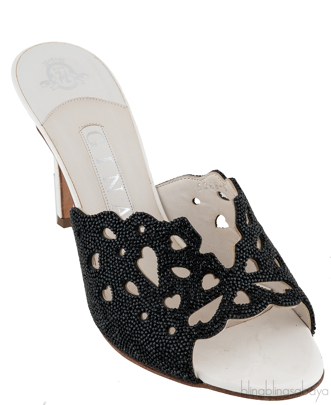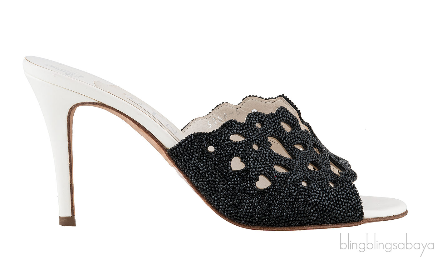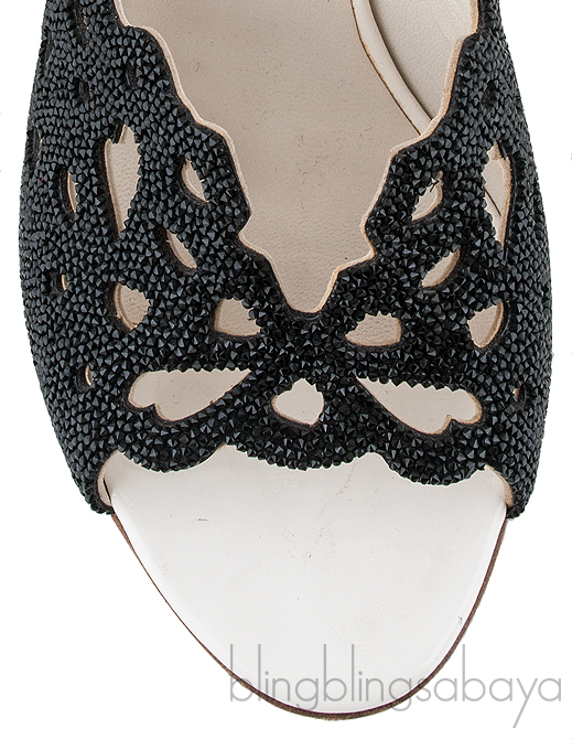 This White & Black Crystal Perforated Heels is crafted in white leather and feature a black crystal design, peep almond toe, heels measuring 100 mm high.