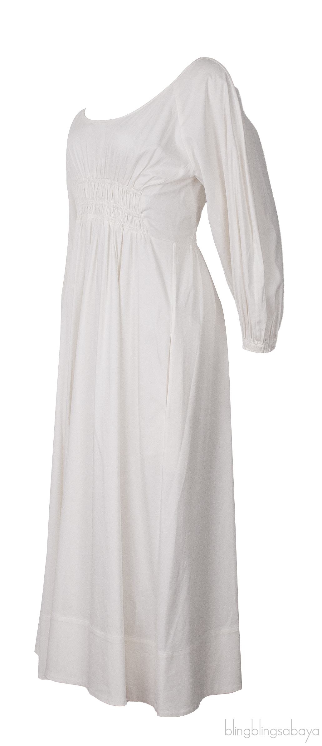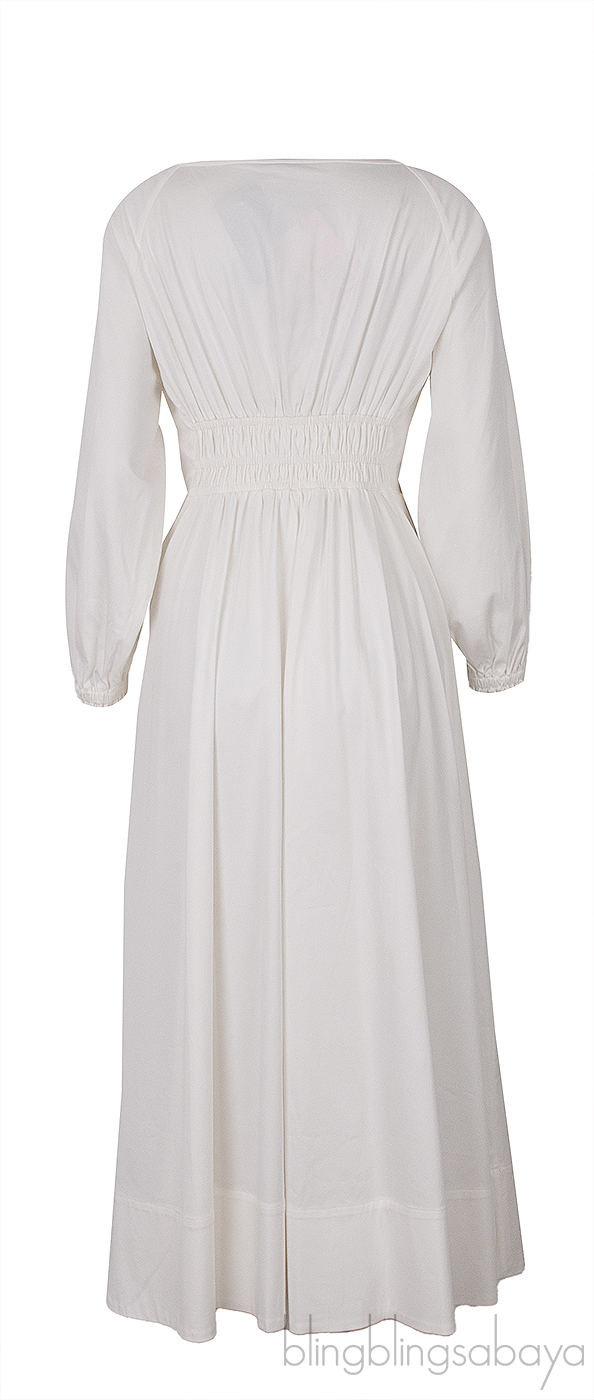 This White Cotton Ruched Waist Midi Dress from Alexis is crafted from cotton, viscose and elastane fabbric in white hue. This dress features a scoop neckline, long sleeves with elastic cuffs, ruched at waist and mid-length hem.