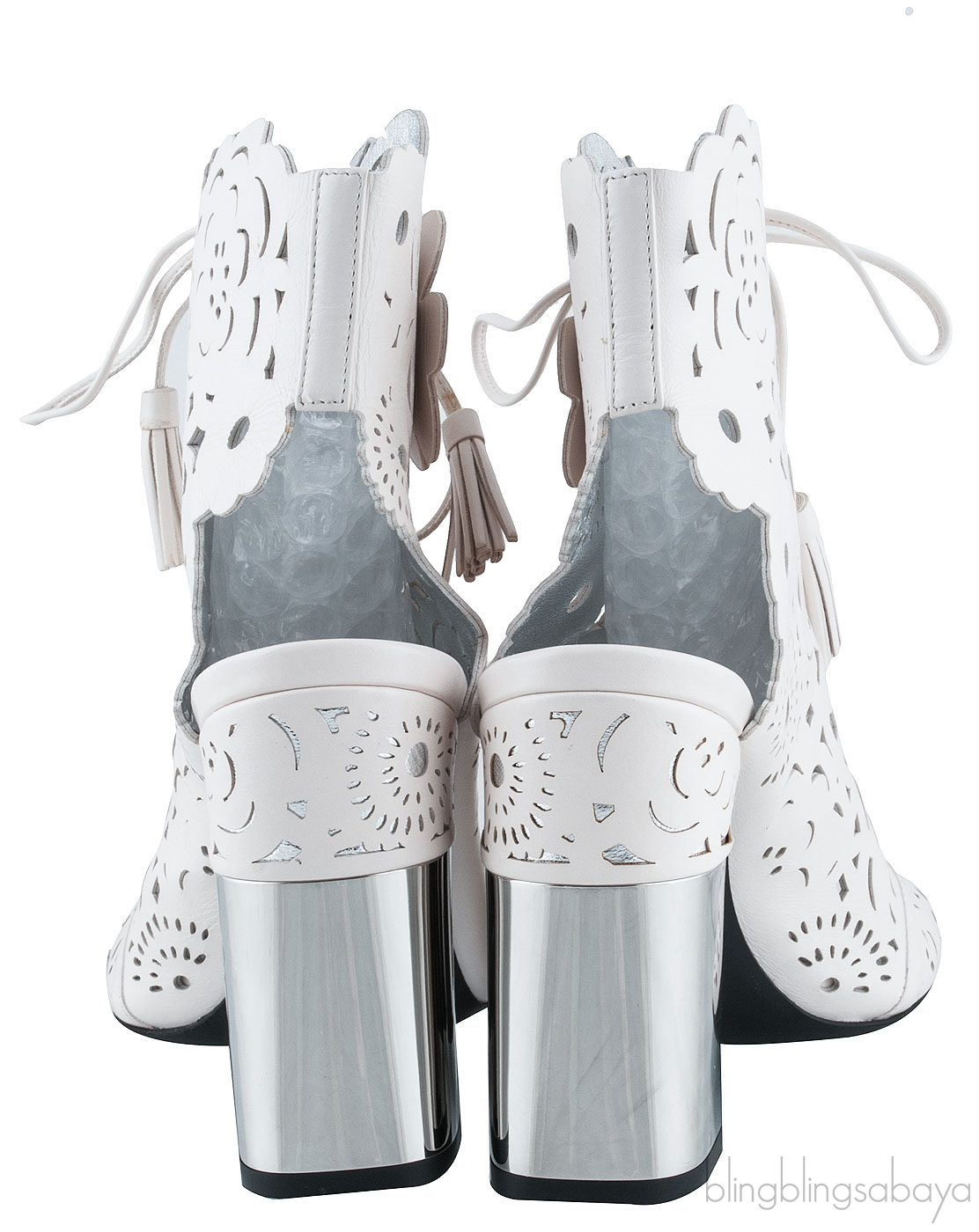 These White Floral Laser Cut Heels from Roger Vivier are crafted from white leather upper with silver leather lining. These features a laser cut floral design with peep almond toe, cut-out at heel counter, leather lace fastening at front with tassel edges, metallic silver stack heel measuring 110 mm high and black leather sole.