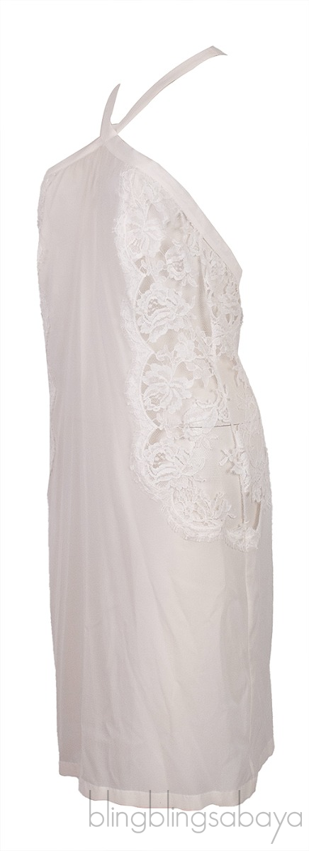 This White Halter Neck Camisole Dress from La Perla is crafted from 91% Silk and 9% Elastane. This camisole dress features a halter neck design, floral lace sheer detailing on both sides, pull-over.