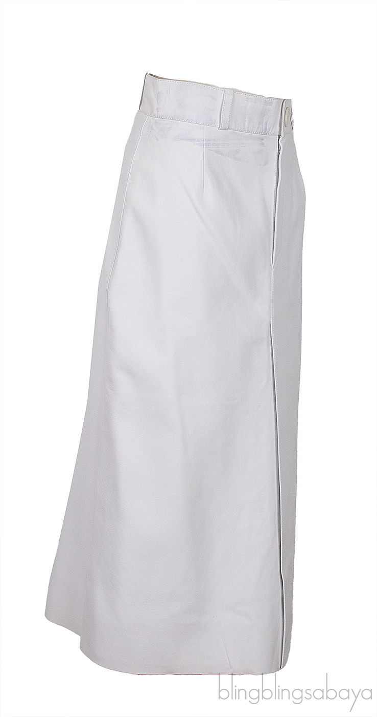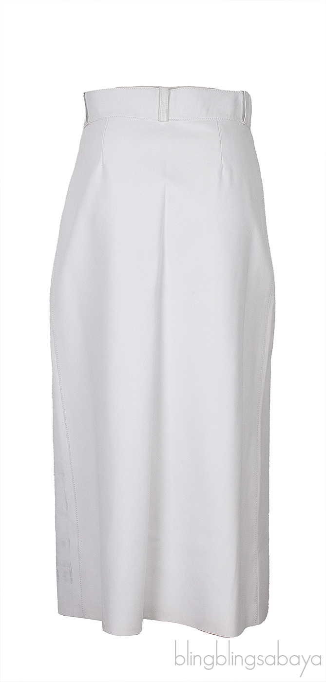 This White Leather Skirt from Balenciaga is crafted from 100% Lambskin leather and 100% Viscose lining in white hue. This skirt features a button and zip fastening at front, belt loops , mid-length and split front