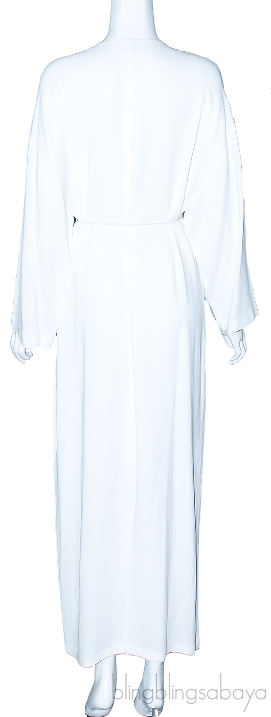 This White Long Sleeve Maxi Dress from Lanvin is made of Viscose & Elastane fabric in pure white. This dress features a round neckline, open front with hook fastening encrusted with crystals, long sleeves, slits are front and rear and detachable belt.