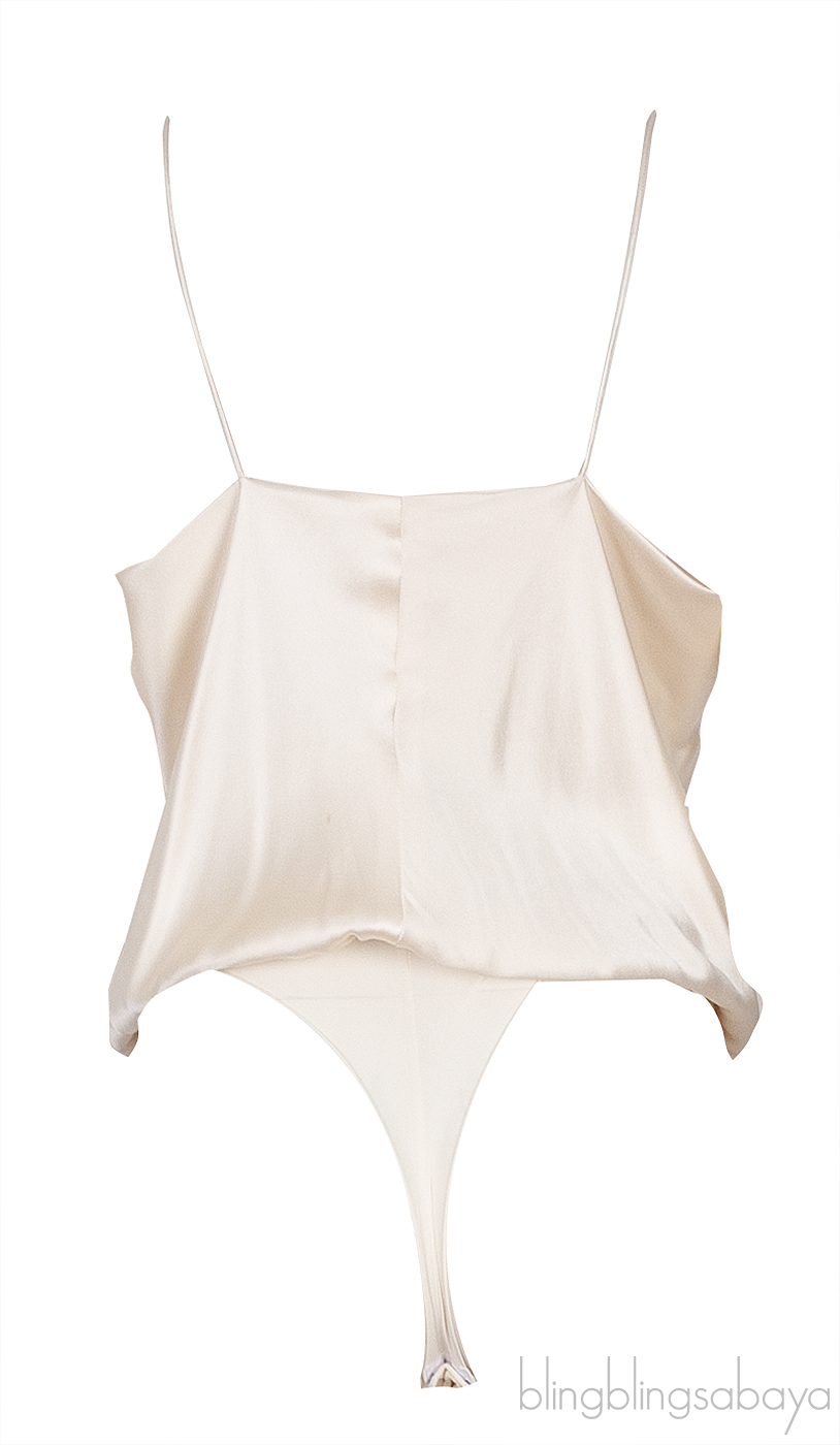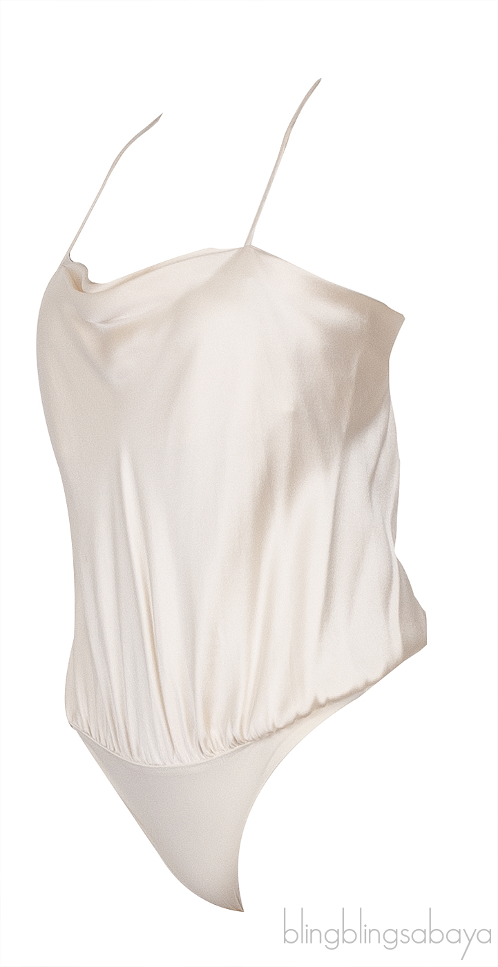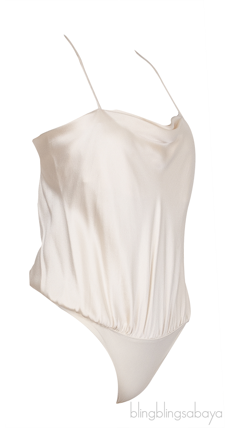This PWhite Pearl Sleeveless Bodysuit from Alix is crafted from white pearl sleeveless bodysuit featuring a drape neckline, elasticized waist, and ottom snap button closure.