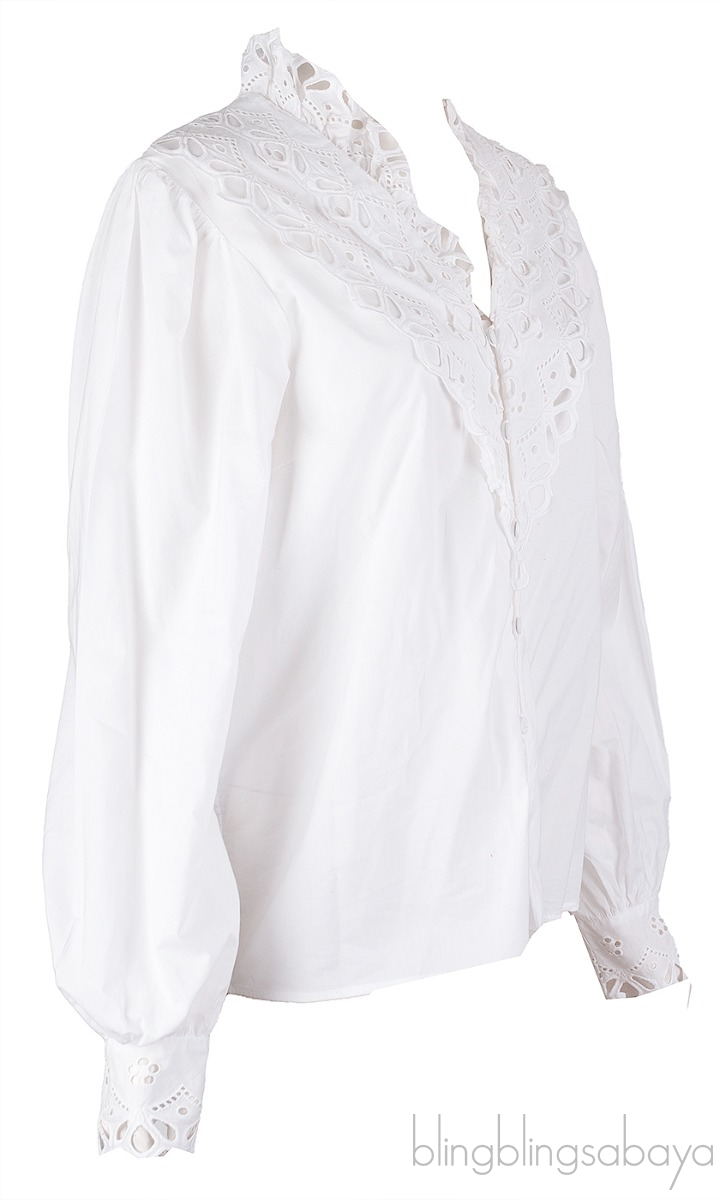 This White Sandra Lace Blouse from Designer's Remix is crafted from 100% Cotton in white featuring v-neckline, stand collar with broderie anglaise detailing at front and cuffs, long sleeves and button fastening through the front.