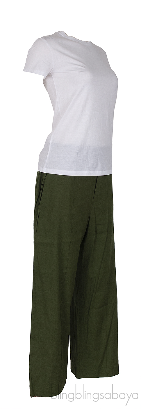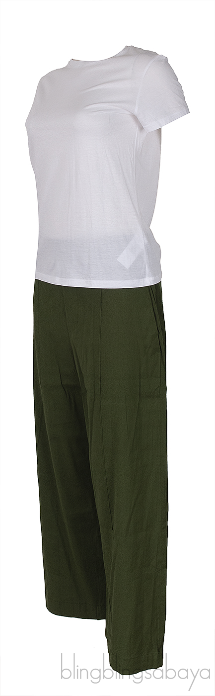 This White T-shirt is crafted from 100% Pima Cotton in plain white hue featuring a crew neckline, short sleeves and pull-over style. This t-shirt if paired with Olive Green Trouser crafted from 59% Linen, 39% Rayon and 3% Spandex. This trouser features an elastic waist line with belt loops, high waist, side pockets and wide leg design.
