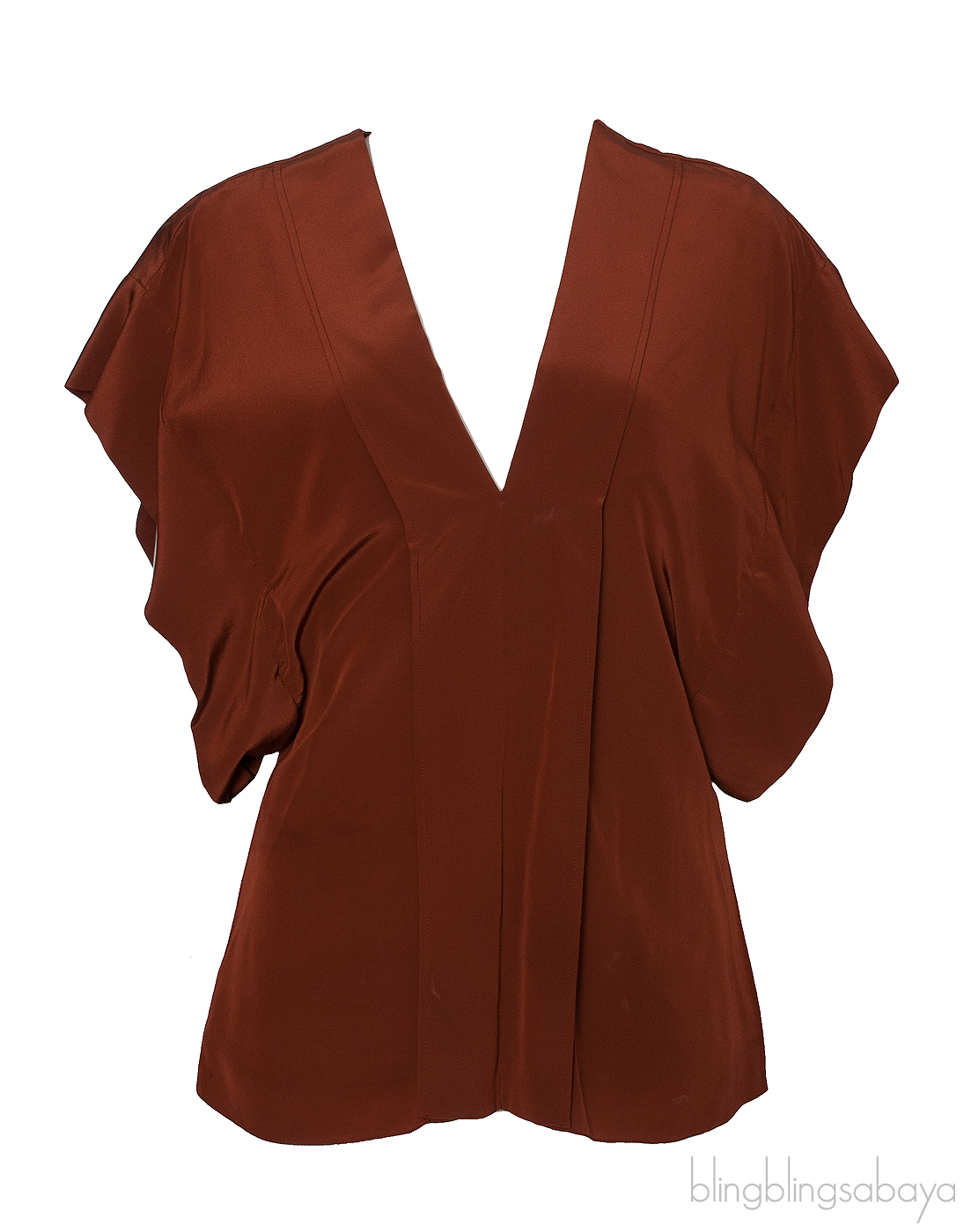 This Wildwood Brown Silk Crepe Blouse from Chloe is crafted from 100% Silk fabric, Featuring silk-crepe blouse features pleated detailing, a v-neck, and kimono sleeves.