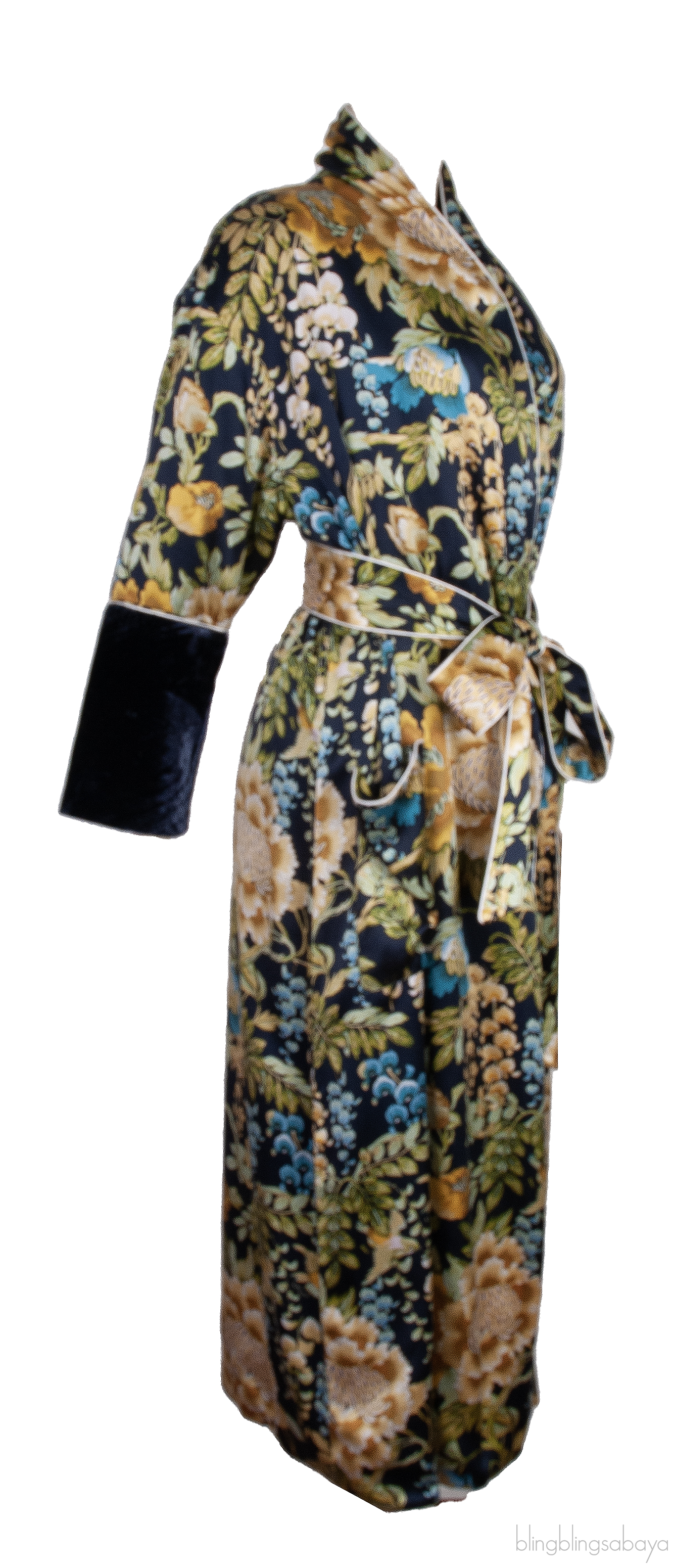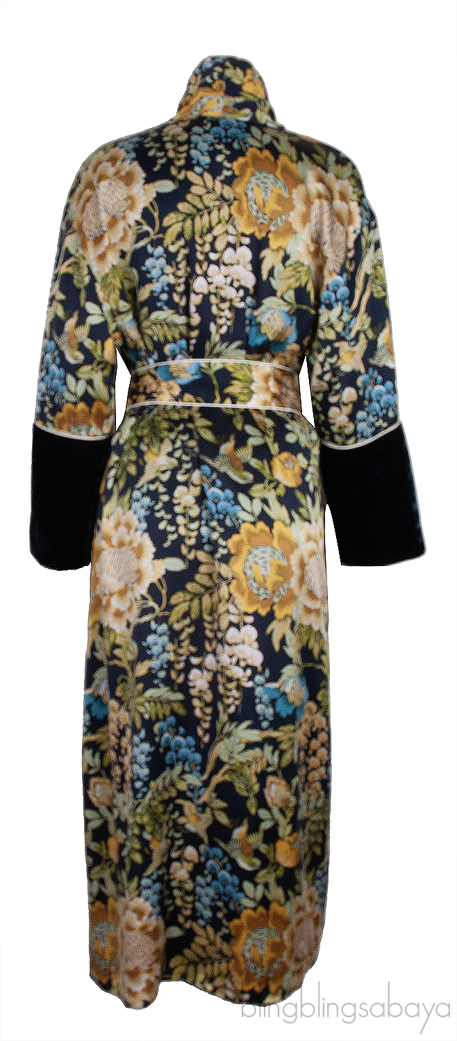 This Olivia von Halle Wrap Printed Robe is made from 100% silk fabric, adorned with an all-over floral pattern. It features two front patch pockets and is designed in a flattering wrap style that ties at the waist. The robe also includes long sleeves with luxurious velvet cuffs..