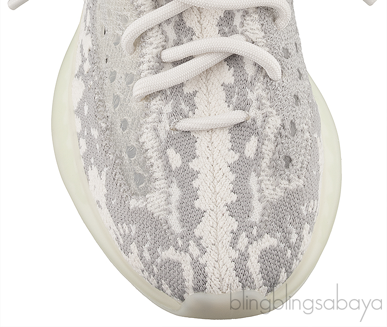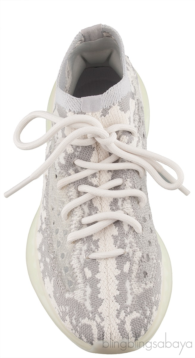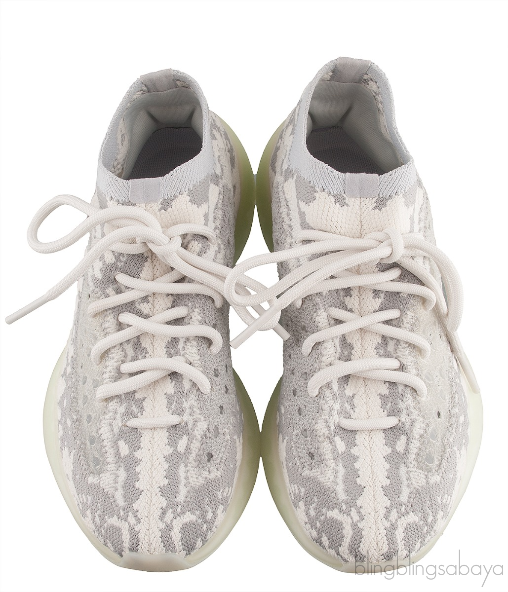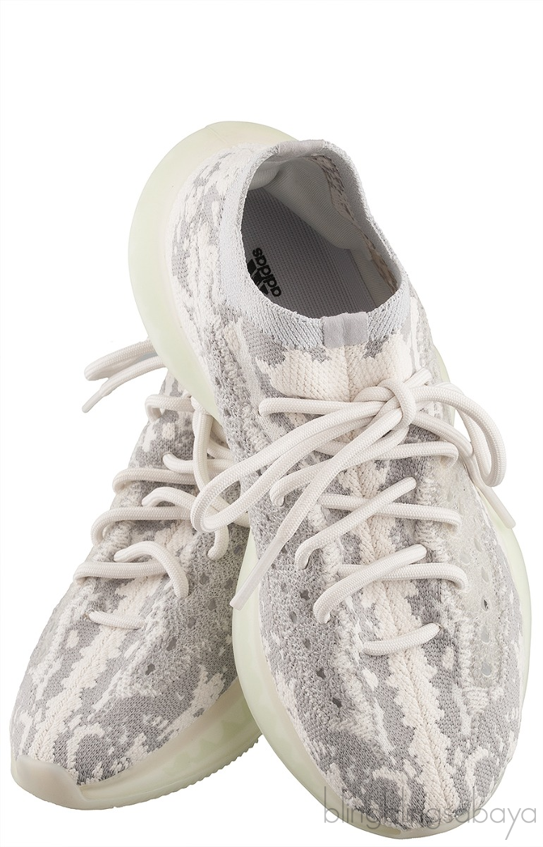 These Yeezy Boost 380 "Alien" from Adidas features sock-like cream-colored Primeknit motif with contrasting grey material woven into the fabric with a milky chunky sole hinting a shade of green. These sneakers released in November of 2019