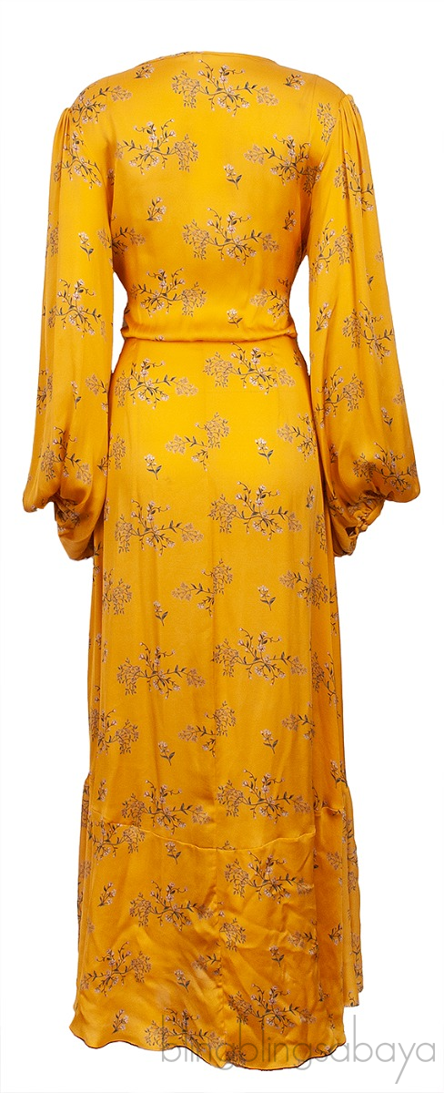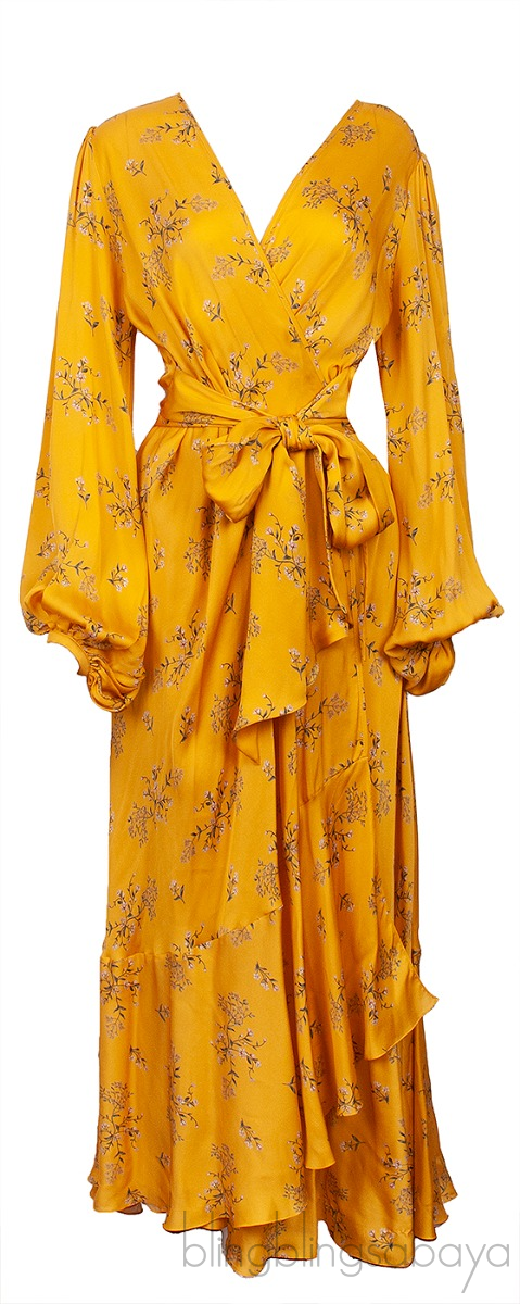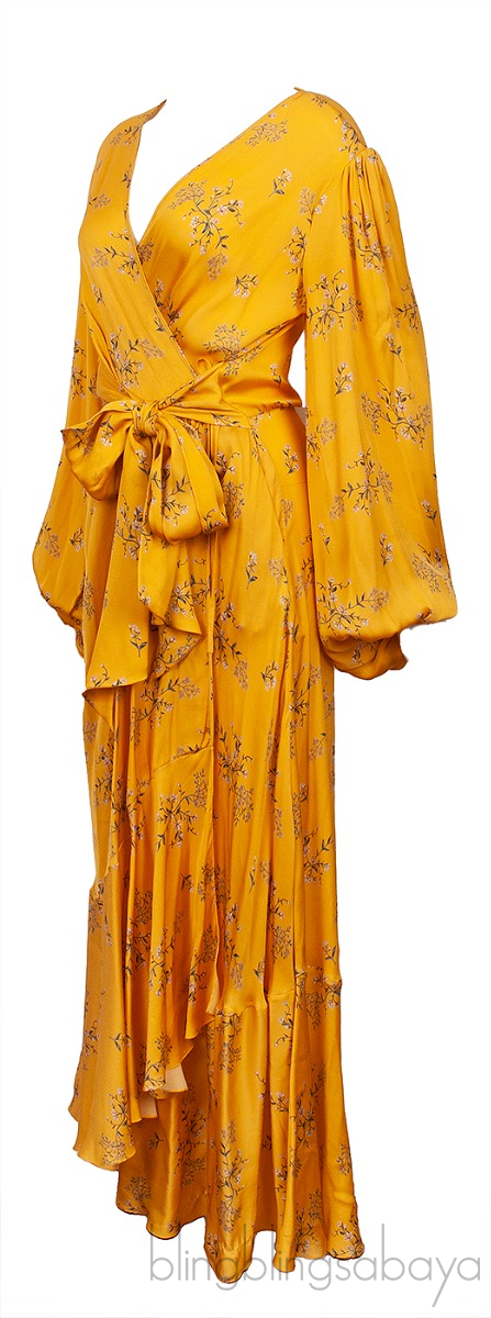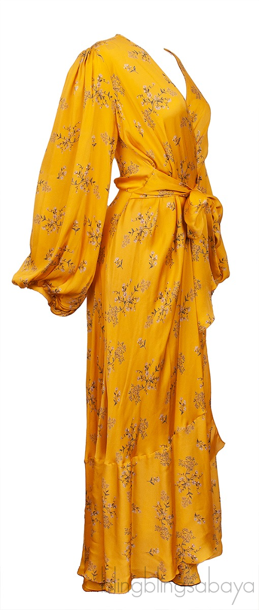 This Yellow Exotic Pitaya Dress from Johanna Ortiz is crafted in 100% Silk fabric in yellow with floral print. This dress features a v-neckline, wrap design with self-tie fastening at waist, bishop sleeves with button cuffs, maxi length and side pockets.