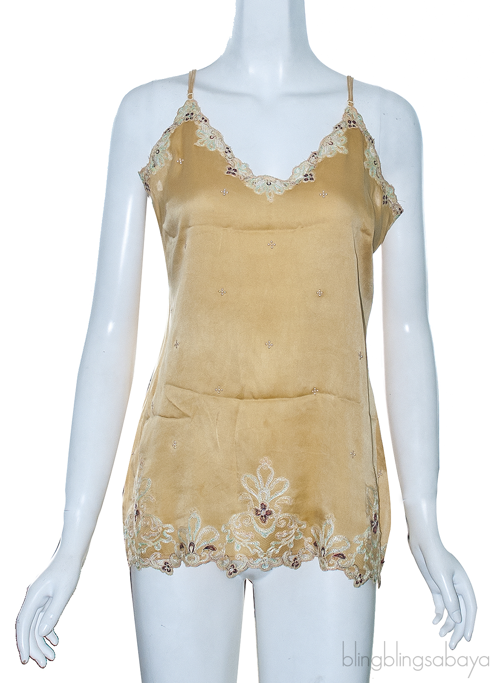This Yellow Lace Trim Camisole Top from La Perla is made of 80% Silk, 15% Polyester &6% Elastane featuring an adjustable string strap, scallop v-neck, lace trimming at neck and hemline and pearl bead embellishment at front.
