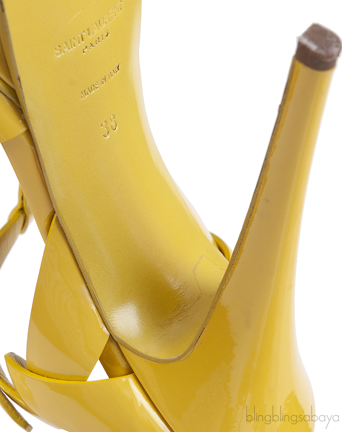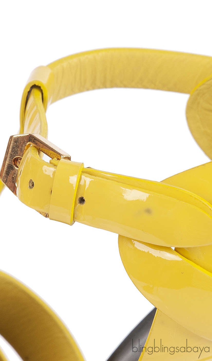 This Yellow Patent Leather Tribute from Yves Saint Laurent is crafted in Yellow patent leather upper with black leather insole. This features an open toe with wide straps loop together over the vamp, adjustable T-strap with the golden buckle, padded insole and leather sole.