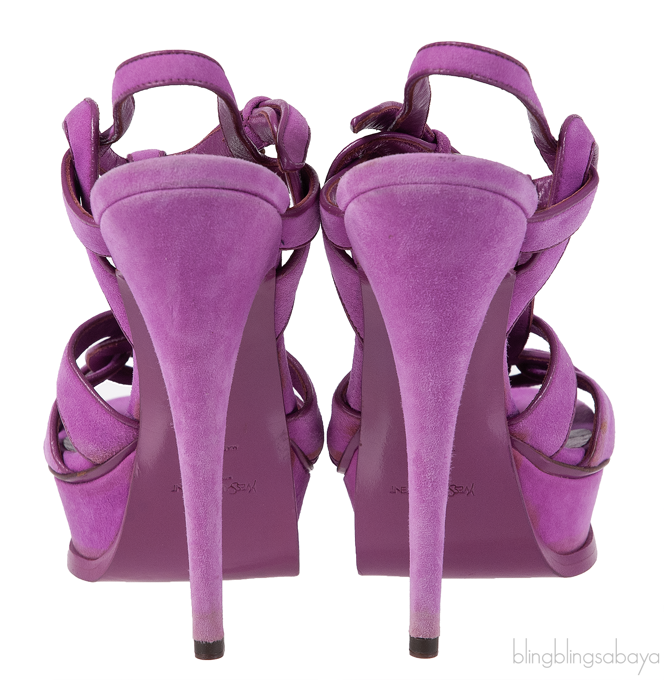 This Purple Suede Tribute Sandals from Yves Saint Laurent is crafted in stunning purple suede leather upper with leather lining. This sandals features a purple wide straps that loop together over the vamp, ankle straps with adjustable buckle, one inch platform with beveled front and 130 mm covered heel.