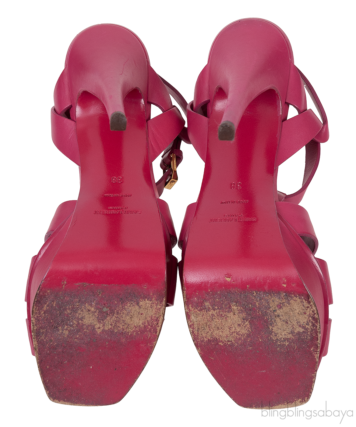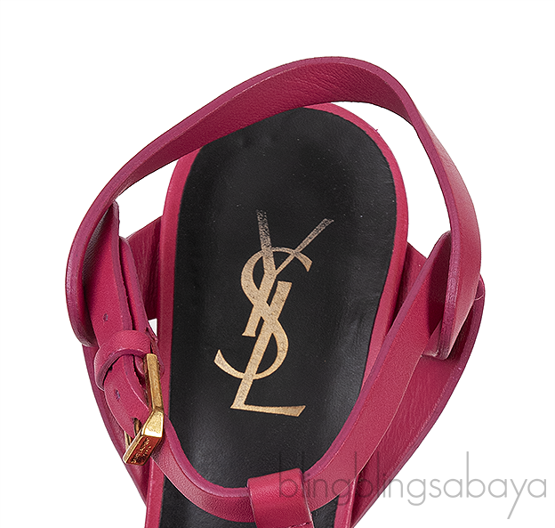 This Fuchsia Matte Tribute Sandals from Yves Saint Laurent is crafted in Fuchsia matte leather upper with leather lining. This sandals features a matte leather wide straps that loop together over the vamp, ankle straps with adjustable buckle, one inch platform with beveled front and 140 mm covered heel.