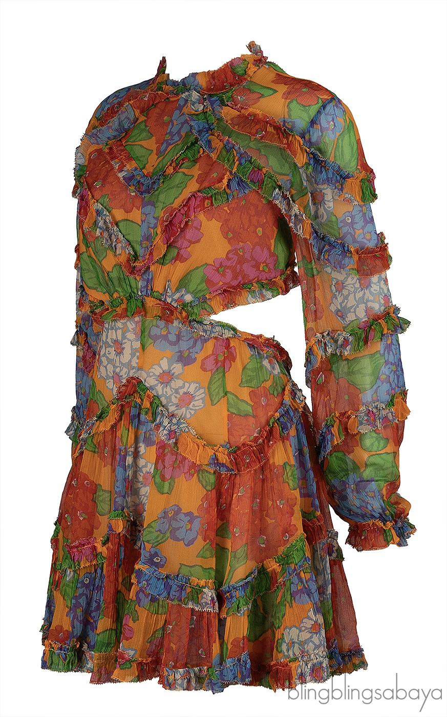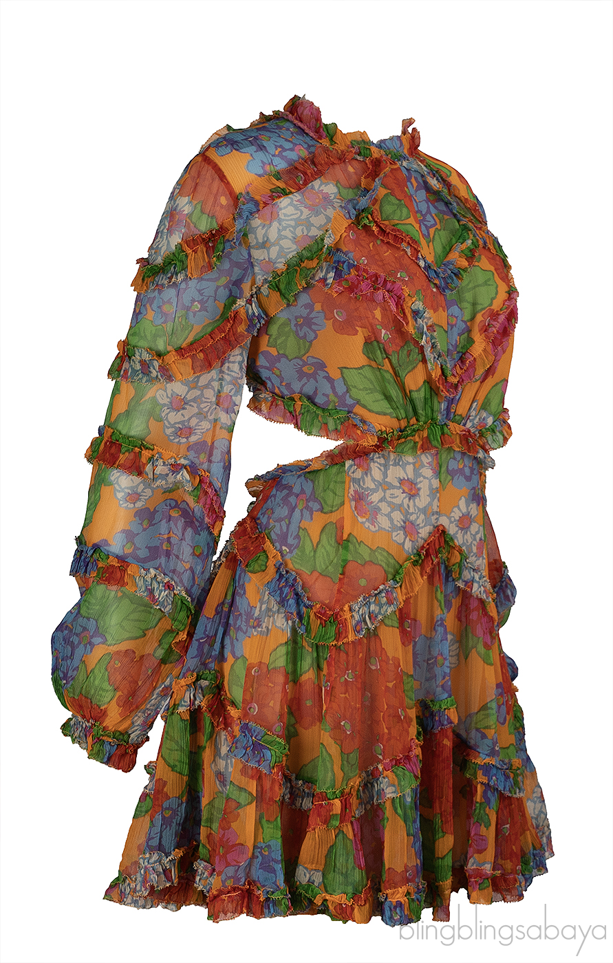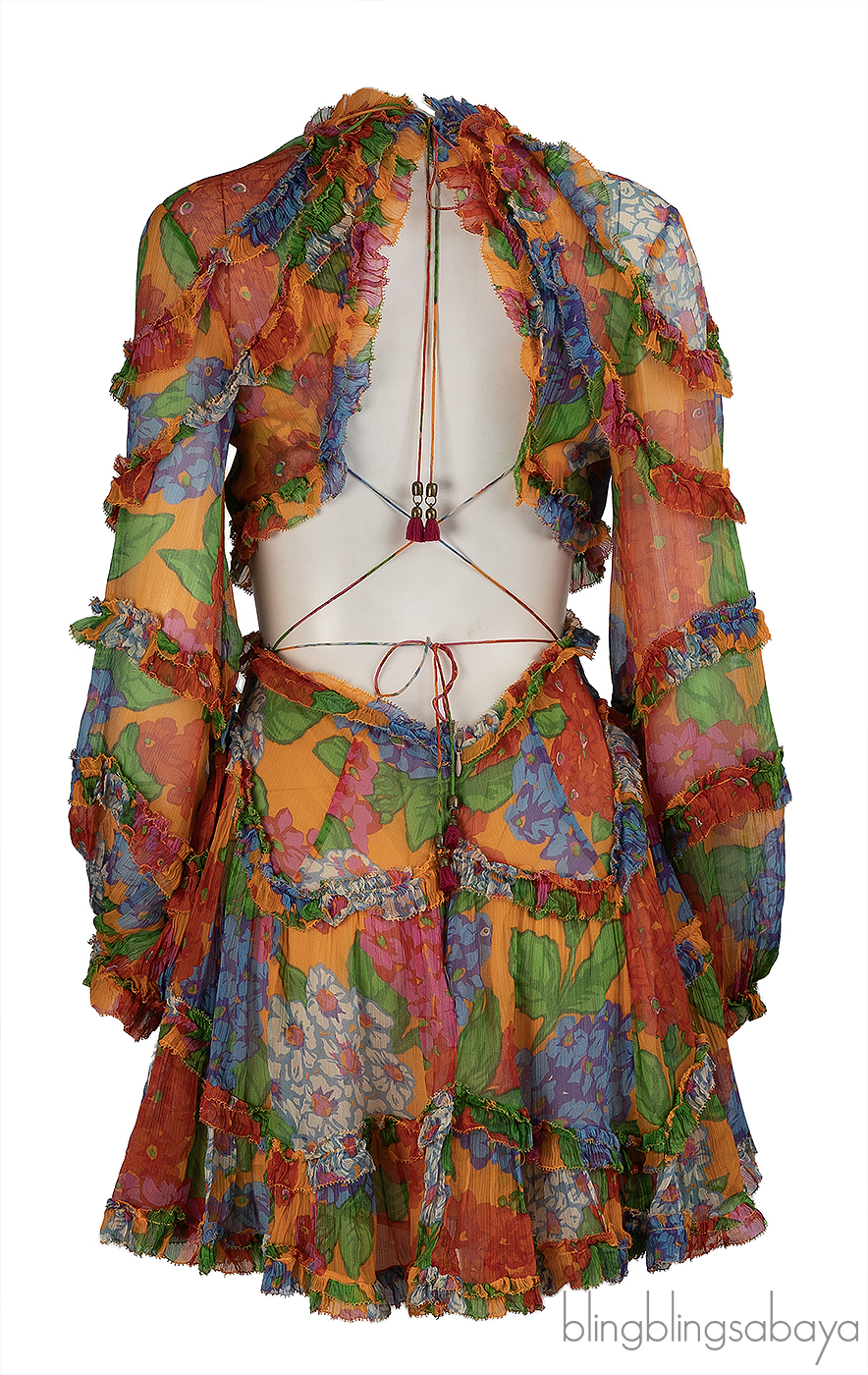 This Zimmerman Floral Riders Frill Mini Dress is crafted from 100% silk with a 100% viscose lining. This dress is fully lined and designed for an elegant finish. It features an open back with tie closures, a hidden zip fastening, and elasticated cuffs for comfort. Made from silk georgette, the design is finished with delicate ruffled trim. Dry clean only..