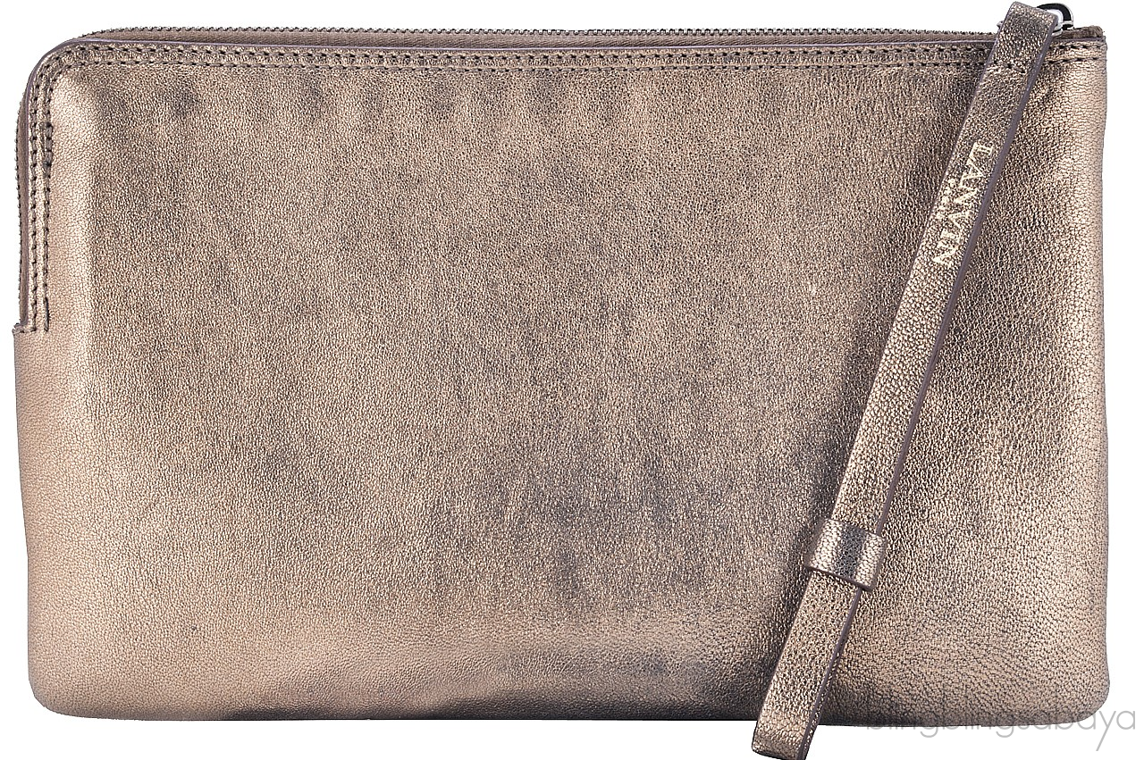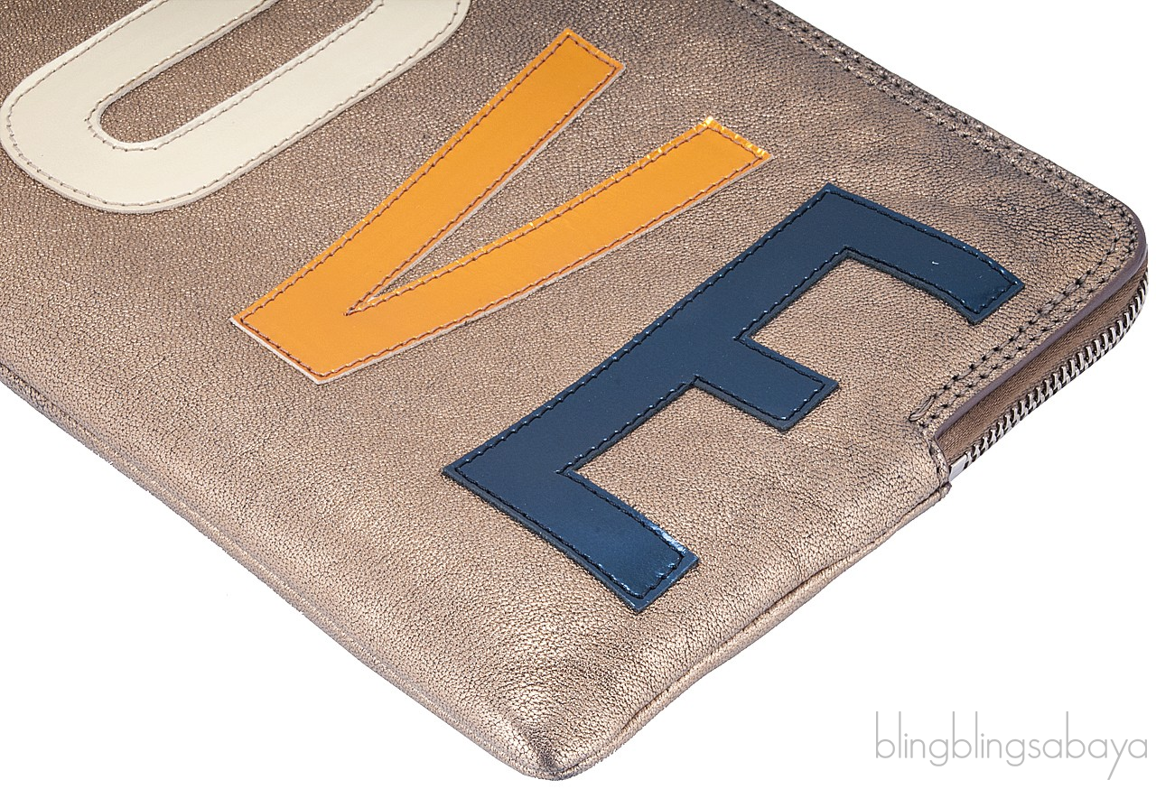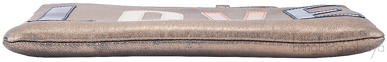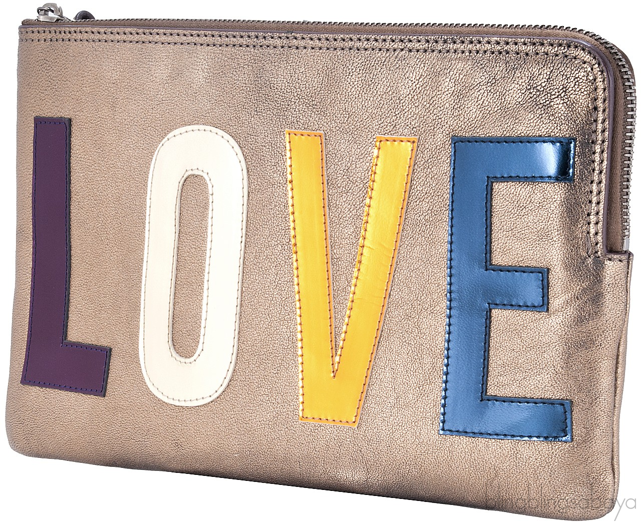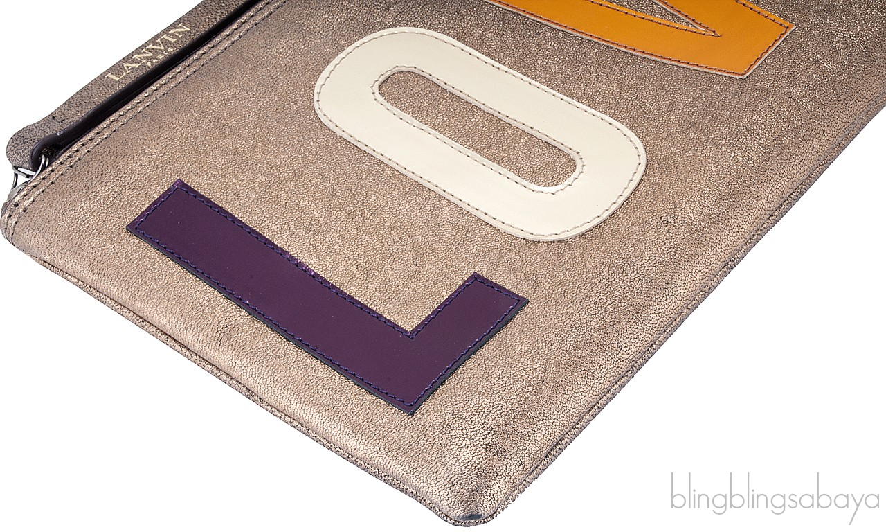 So young and cool "LOVE" Clutch from Lanvin is crafted in Bronze Lambskin Leather with multi-color patent "LOVE" stitch detailing at front. It has an exposed top zip fastening with long branded pull tab. Interior is lined with Navy Blue Fabric with one patch pocket and small leather logo2.