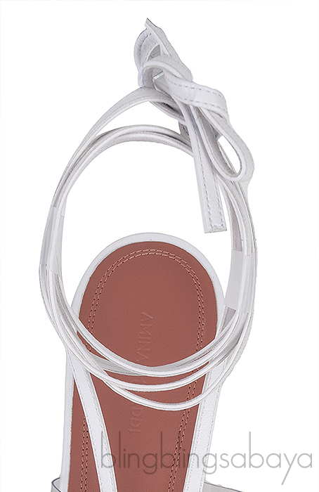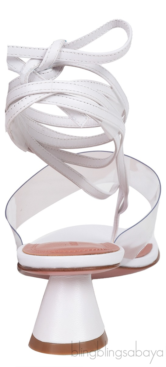 These Zula White PVC Leather Sandals from Amina Muaddi are crafted from white leather and pvc with leather lining. These sandals features a PVC strap and white leather long straps that can wrap around the feet, leather lined insole and sole, and heels measuring 40 mm high.