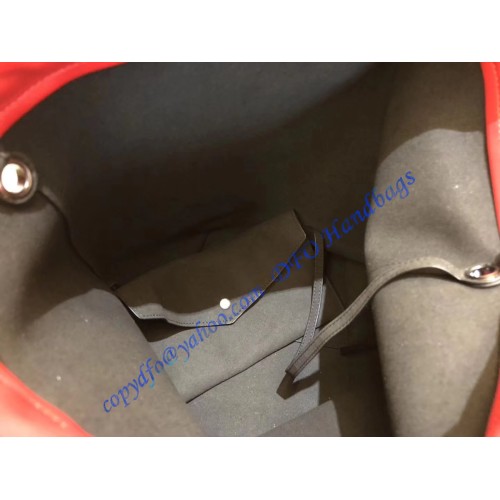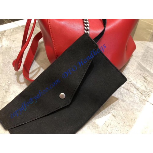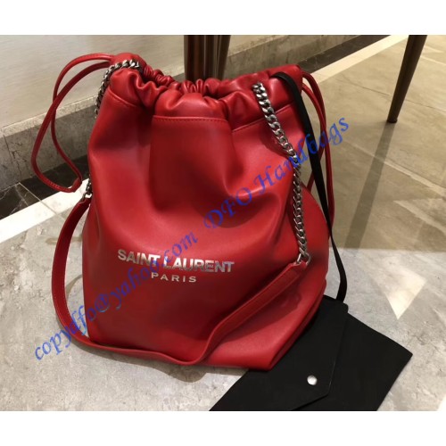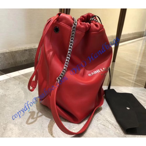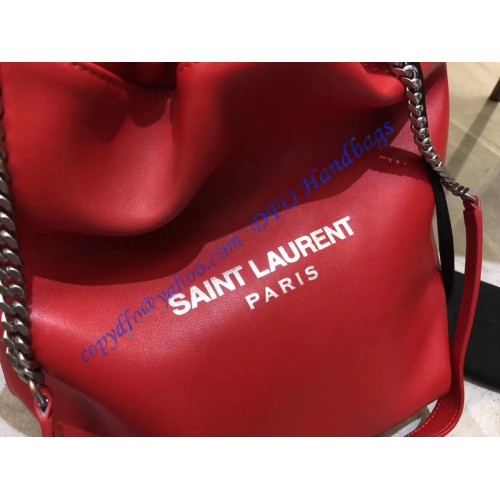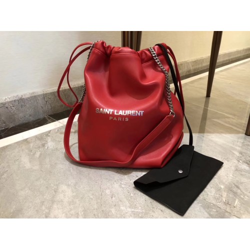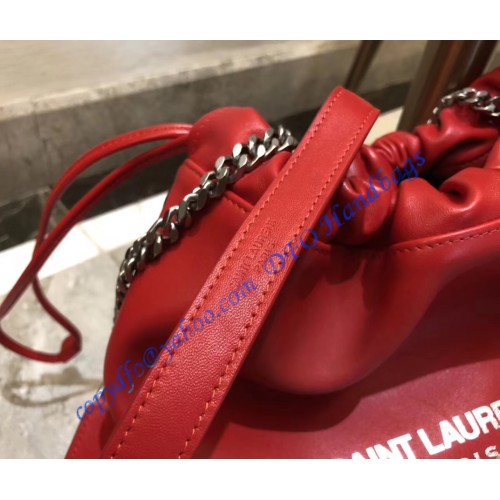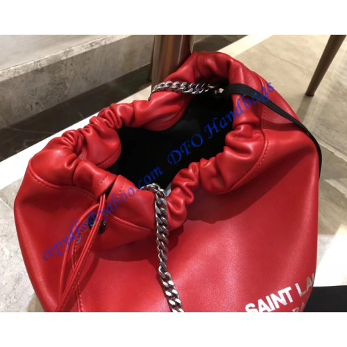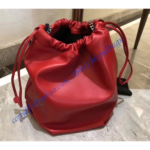 The Saint Laurent teddy drawstring bag in red is 35cm wide on the top (13.8in), 20cm wide on the bottom (7.9in), 29cm long (11.4in) and 17cm deep (6.7in).